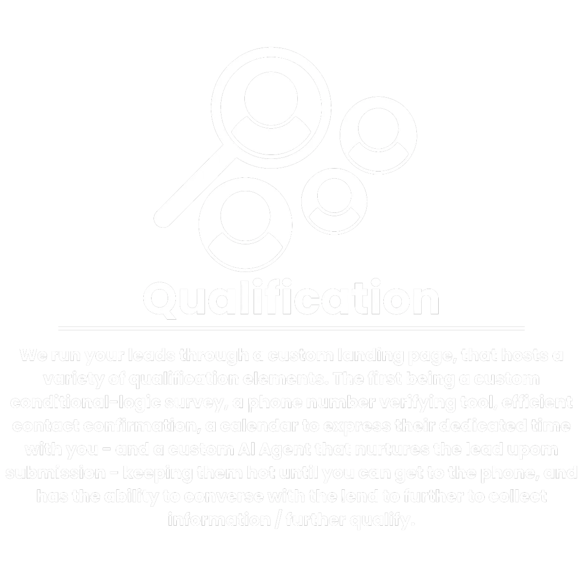 We use a multi-step qualification process designed to filter out anyone who isn't a serious prospect. First, we run highly targeted ad campaigns that speak directly to your ideal homeowner. Each lead is then sent to a landing page with a qualification survey built around the criteria you set. We confirm their contact information, nurture them through automated follow-up messages to keep them engaged, and send automated reminders to confirm appointments, so by the time you speak with them, they're warmed up,
